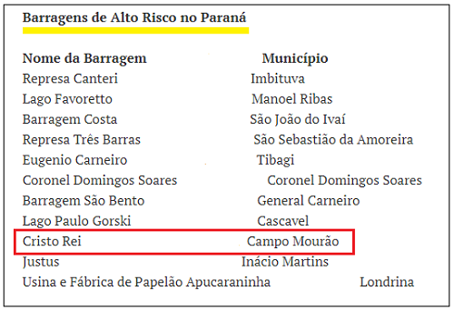 Sim. É o que diz relatório da Agência Nacional de Águas, divulgado em novembro. É o último documento a respeito, com base em dados de 2017. No Paraná são 450 barragens, sendo que 11 foram classificadas como de "alto risco". Uma delas é mourãoense e fica na indústria Cristo Rei, na região do Barreiro das Frutas.
