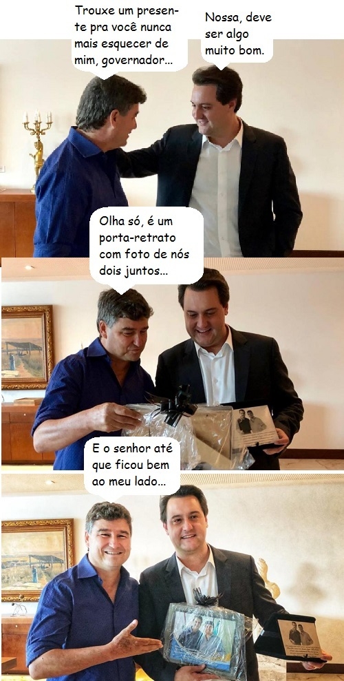 Lembra que o prefeito de Terra Boa, Valter Peres, foi semana passada a Curitiba para se apresentar ao novo governo do Estado? "Quem não é visto não é lembrado", disse ele na saída. Pois veja que Peres esteve até com o governador Ratinho Jr, com direito a deixar uma "lembrancinha" no Palácio Iguaçu.
