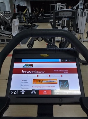 O primeiro suplente de vereador João Marcos Feitoza, de Campo Mourão, está trabalhando em Curitiba. E olha só o que ele encontrou na academia de ginástica: esteira com wi-fi e telinha na internet. João Marcos não pensou duas vezes e foi logo acessando a Boca Santa para se informar sobre a "terrinha". Ah, isso é que é "mens sana in corpore sano"...