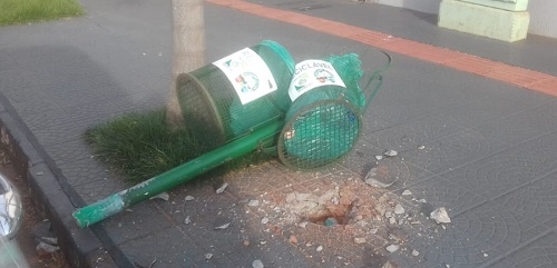 Lixeiras derrubadas, nesta sexta-feira, na av. Irmãos Pereira, esquina com rua Araruna, em Campo Mourão.