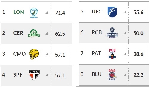 Campo Mourão, com quatro vitórias e três derrotas, está em terceiro, com 57,1% de aproveitamento.