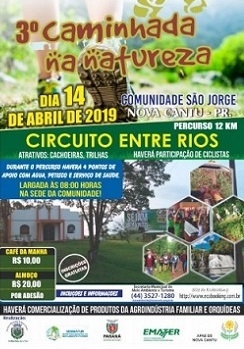 Nova Cantu realiza neste domingo (8h) a 3.a Caminhada Internacional na Natureza. O circuito Entre Rios terá 12 km entre trilhas e estradas rurais. A saída será na comunidade São Jorge. A caminhada é gratuita, mas há opcionais de café da manhã (R$ 10) e almoço (R$ 20). A caminhada seguinte será em Campo Mourão, dia 5 de maio, com o circuito Salto Boicotó.