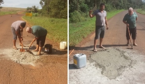 Funcionários da empresa que transporta alunos do ensino superior de Roncador tapam buraco na rodovia entre Roncador e Iretama.