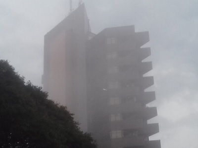 Neblina na manhã desta segunda-feira sobre o edifício Likes, no centro de Campo Mourão. Ivo Quenehem (QI TV)