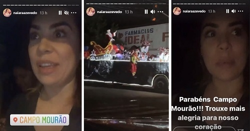 A cantora Naiara Azevedo estava chegando a Campo Mourão, domingo à noite, e bem na hora que parou num semáforo da perimetral Tancredo Neves passou o cortejo natalino sobre rodas, da Associação Sou Arte. De dentro do carro, ela filmou tudo e postou no Instagram. Brincou que o Papai Noel estava com poucas renas e tudo, mas parabenizou Campo Mourão pelo "espírito natalino".