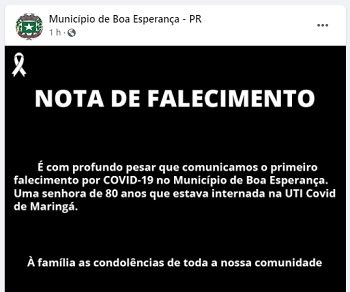 A prefeitura de Boa Esperança confirmou neste sábado a primeira morte no município por covid-19. Foi uma mulher de 80 anos que estava na UTI em Maringá. Agora 24 dos 25 municípios da região tem óbitos confirmados pela doença. O total foi a 154. Apenas Rancho Alegre do Oeste está fora da lista.