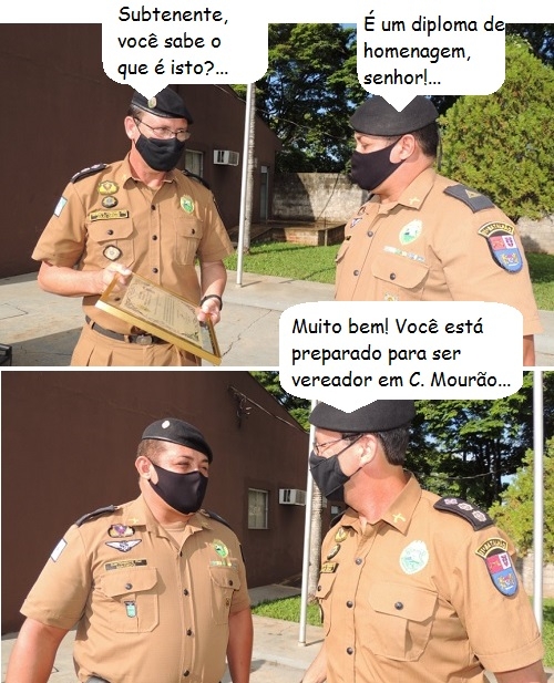 Os cliques são de sexta-feira, quando o subtenente Claudemir Macedo foi homenageado pelo 11° BPM. Vereador eleito em Campo Mourão, ele entrou para a reserva da polícia. O comandante Júlio César Viera da Rosa entregou a homenagem. No mais, cá pra nós: se a nova legislatura seguir as anteriores, Macedo vai participar de muitas sessões de homenagens...