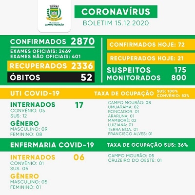 Campo Mourão registrou 72 novos casos de covid-19 nesta terça-feira. É mais um recorde da cidade. O número de mourãoenses com o vírus ativo subiu para 482. A UTI está com 17 pacientes - 12 pelo SUS (100% de ocupação - foram criados mais três leitos) e cinco por convênios (87%). As boas notícias do dia é que a ocupação na enfermaria caiu para 36% e que o número de casos suspeitos foi reduzido para 175.