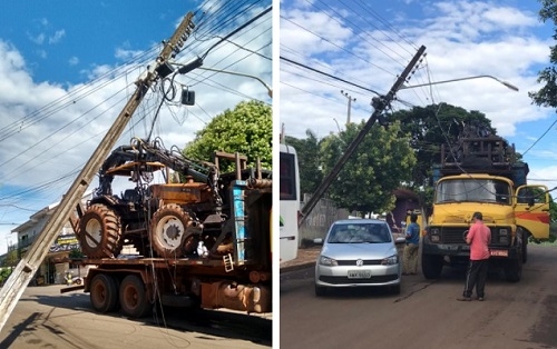 Caminhão transportando trator se enroscou nos fios e derrubou poste perto da prefeitura Corumbataí do Sul. O paço municipal ficou um dia sem energia e dois sem internet.