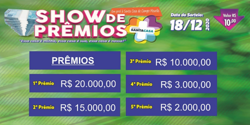 E aí, não comprou ainda a cartela do Show de Prêmios da Santa Casa de Campo Mourão? Então corra que o sorteio é nesta sexta-feira, às 19h, pela TV Carajás. Custa só R$ 10 e a premiação soma R$ 50 mil, divididos em cinco prêmios (veja acima). A arrecadação será para ajudar o hospital a pagar o 13.o salário.