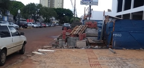 Na cultura da construção civil de Campo Mourão calçada serve de depósito de materiais de construção. Se no centro, na avenida principal, tem isso, imagine no resto da cidade.