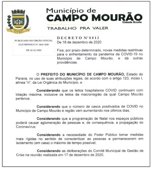 A prefeitura de Campo Mourão editou novo decreto para o enfrentamento ao coronavírus.