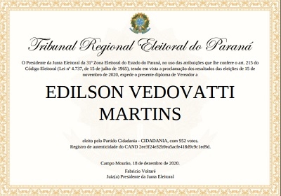 Desta vez, por conta do coronavírus, não teve a tradicional cerimônia de diplomação no Teatro Municipal de Campo Mourão. Assim, nada de reunir os eleitos da comarca, nada de convidar familiares, nada de discursos. Mas teve o diploma da Justiça Eleitoral, emitido via internet. Na reprodução, o documento de Edilson Martins, que passará, ao lado de Elvira Schen, a ser um dos veteranos da Câmara, com três mandatos.