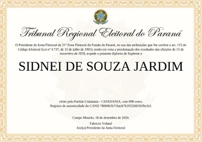 O vereador Sidnei Jardim, de Campo Mourão, destacou em postagem no Facebook que recebeu nesta sexta-feira seu sétimo diploma da Justiça Eleitoral. Os primeiros suplentes também são diplomados. Jardim vem de seis mandatos seguidos, recorde do município, mas desta vez ficou na primeira suplência do Cidadania.