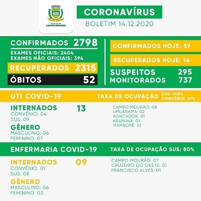 Campo Mourão confirmou nesta segunda-feira mais 57 casos de covid-19. Novo recorde para um dia só (com exceção no período de surto na cadeia). Também foram confirmadas mais duas mortes - um homem de 61 e outro de 85 anos. O número de mourãoenses com o vírus ativo também subiu bem: 431. A UTI segue lotada.