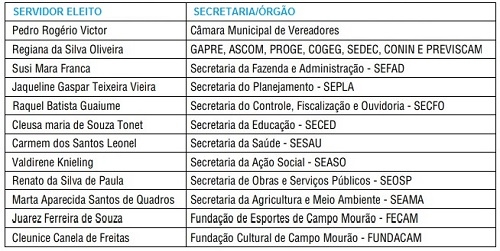 Saiu o resultado da eleição que definiu quem será homenageado este ano com o título de "Servidor do Ano" da prefeitura de Campo Mourão. São 12 funcionários, cada um representando uma secretária ou órgão. A lista inclui a Câmara e as fundações de Cultura e de Esportes. No próximo dia 28 se comemora o Dia do Servidor.