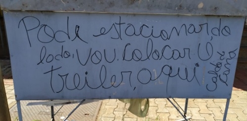 Rua Roberto Brzezinski, centro de Campo Mourão. Dono de trailer deixou recado na lixeira para que não se estacione no local. "Pode estacionar do lado. Vou colocar o treiler aqui".