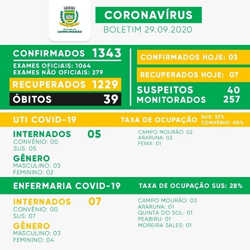 Três casos de covid-19 foram confirmados nesta terça-feira em Campo Mourão. O total foi a 1.343. Houve sete recuperados e eles agora são 1.229. Os mourãoenses com o vírus ativo agora são 75. A ala covid da Santa Casa está com 12 pacientes internados - cinco na UTI (33% de leitos do SUS) e sete na enfermaria (28% dos leitos do SUS).