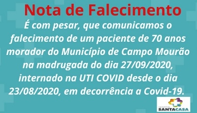 A Santa Casa confirmou neste domingo a morte, por covid-19, de morador de Campo Mourão 70 anos. Ele estava internado há mais de um mês. Agora são 39 óbitos por coronavírus no município e 108 na região.