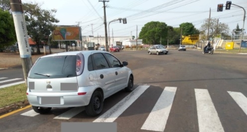 Carro espera sinal abrir parado sobre a faixa de pedestre.