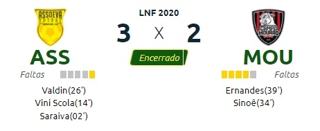 Campo Mourão perdeu neste domingo para a Assoeva, em Venâncio Aires/RS, pela Liga Nacional de Futsal. O placar final foi 3 a 2, mas chegou a ficar 3 a 0 para os gaúchos. Os mourãoenses seguem em quinto lugar no grupo C, com nove pontos. Próximo jogo quarta-feira (21h), em Jaraguá do Sul/SC.