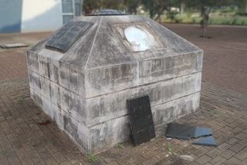 Monumento à Bíblia, ao lado da Estação da Luz de Campo Mourão, quebrado em provável ato de vandalismo.