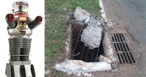 O robô do Perdidos no Espaço foi para Goioerê alertar o perigo na av. Tiradentes, em frente a Fiat, onde a tampa do bueiro está quebrada.