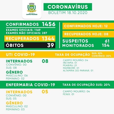 Doze novos casos de covid-19 foram confirmados neste domingo em Campo Moiurão. Bem acima da média diária dos últimos dias. Os recuperados foram oito. Ou seja: voltou a aumentar o número de moradores com o vírus ativo. Agora são 73. Na UTI Covid a taxa de ocupação caiu para 53%, com oito pacientes internados