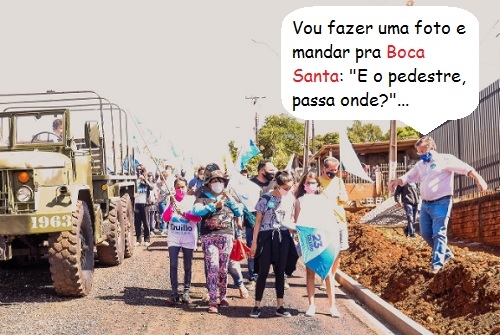 O clic é de uma caminhada da campanha de reeleição do prefeito de Campo Mourão, Tauillo Tezelli. Olha ele ali, se equilibrando sobre montes de terra na calçada. Tudo bem, é uma rua em obras, mas calçadas com obstáculos é o que não falta por Campo Mourão...