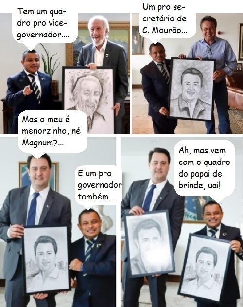 Olha quem esteve segunda-feira no Palácio Iguaçu, em Curitiba. Sim, ele, o "recepcionista oficial" de Campo Mourão, Magnum Alves. Entregou em mãos os desenhos que fez do governador Ratinho Jr, do vice-governador Darci Piana e do secretário de Estado Márcio Nunes. Para o governador, aliás, teve quadro também do pai dele, o apresentador Ratinho, do SBT.