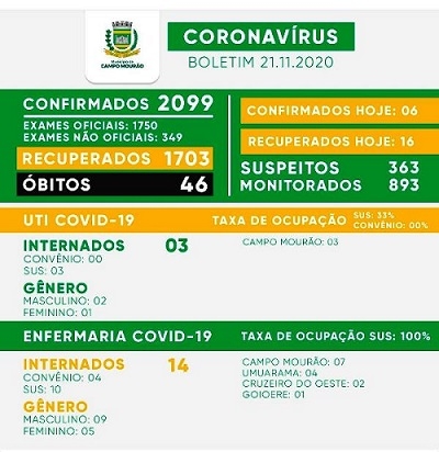 O boletim covid deste sábado trouxe mais duas mortes em Campo Mourão. Agora são 46. O número de casos suspeitos saltou de 275 para 363 de um dia para o outro. De novos casos foram seis, com 16 recuperações. Assim, são 350 os mourãoenses com o vírus ativo. A enfermaria covid segue lotada.