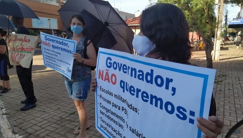 Professores ligados à APP-Sindicato não deixaram barato a visita do governador Ratinho Jr a Campo Mourão. Foram com faixas e cartazes para o calçadão, onde sabiam que a carreata com o governador iria passar. A bronca foi contra escolas militarizadas, provas para PSS, congelamento de salários e terceirização.