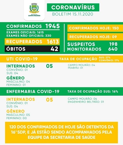 Assustador o boletim covid-19 deste domingo em Campo Mourão. Foram confirmados mais 150 casos. Detalhe: desse total 120 são presos da cadeia local. Os recuperados foram nove. Os casos suspeitos são 198. Na UTI convid há cinco leitos ocupados, sendo quatro pelo SUS (índice de 27%).
