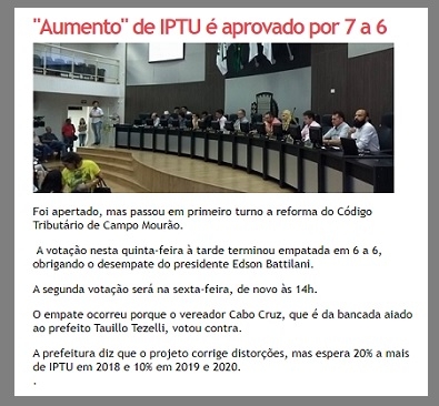 Lembra do projeto da prefeitura de Campo Mourão que no final de 2017 aumentou o IPTU? Foi polêmico e acabou aprovado na Câmara por 7 votos a 6. Detalhe: Nenhum dos vereadores que votou contra se reelegeu. Dos sete favoráveis, quatro foram reeleitos.