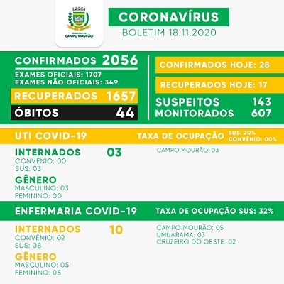 Boletim Covid-19 desta quarta-feira confirma mais 28 casos em Campo Mourão, além de 17 recuperados. O número de mourãoenses com o vírus ativo subiu para 355. O boletim também confirma a 44ª morte por coronavírus. Com os óbitos, a ocupação na UTI Covid caiu para 20%, com três pacientes internados.