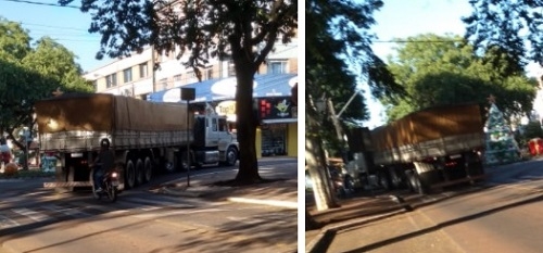 Sexta-feira, às 7h15. Carreta bitrem fragrada no calçadão de Campo Mourão. Com requintes de manobras. Não ia conseguir descer pela rua Brasil, então deu ré e foi pela contramão na avenida...