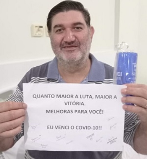 O vereador Claudinei Grella, de Campo Mourão, postou foto nas redes socias para comemorar a recuperação da covid-19. "Em nome de Jesus, eu venci o covid", escreveu. Na foto ele aparece ainda no hospital mostrando um cartaz com a frase "Quanto maior a luta, maior a vitória". Grella só assumiu o mandato em setembro, em substituição a Edson Battilani, que morreu por complicações da covid-19.