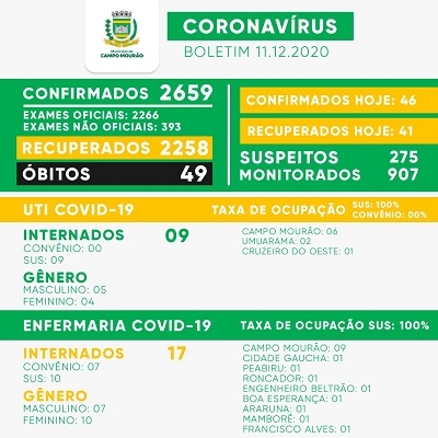 Mais 46 casos de covid-19 foram confirmados nesta sexta-feira em Campo Mourão. Houve 41 recuperados e o número de moradores com o vírus ativo subiu para 353. Os nove leitos do SUS na UTI Covid estão ocupados (100%). Na enfermaria são 17 os leitos ocupados, sete por convênios e 10 pelo SUS (100%).