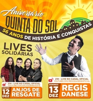 Segunda-feira será aniversário de Quinta do Sol. O município vai complater 56 anos (se emancipou de Fênix). Para comemorar, em tempos de pandemia, só com lives. E serão duas. Neste sábado (21h) tem Anjos do Resgate e, domingo (21h), Regis Danese. Tudo pelo Youtube. Detalhe: as lives serão beneficentes em prol uma criança de Engenheiro Beltrão que precisa de cirurgia.