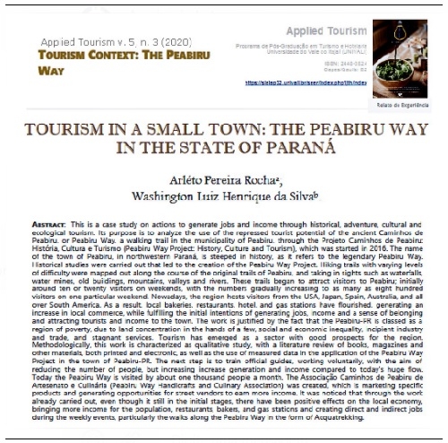 Olha que chique: o projeto Caminhos de Peabiru traduzid para o inglês na revista Applied Tourism. O artigo "Turismo em uma Pequena Cidade: Os Caminhos de Peabiru-PR", foi apresentado ano passado no Fórum Internacional de Turismo, em Foz do Iguaçu. Trabalho dos historiadores Arléto Rocha e Washington Luiz. Foi parar na revista mantida pelo Programa de Pós-Graduação em Turismo e Hotelaria da Universidade do Vale do Itajaí (Univali).