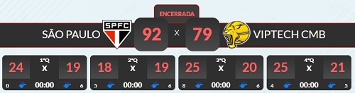 Campo Mourão até que venceu o segundo quarto (19 a 18) e ficou à frente do placar no início do segundo tempo, mas não deu para segurar o São Paulo pelo NBB, não. Jogando no ginásio do Morumbi, nesta quinta-feira à noite, os donos da casa venceram por 92 a 79. Próximo jogo sábado (9h), de novo no Morumbi, contra o Pinheiros, que ainda não ganhou de ninguém e segura a lanterna do torneio.