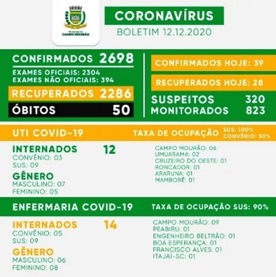 Campo Mourão teve neste sábado mais uma morte por covid-19 (um homem de 67 anos). Foi a 50ª desde o início da pandemia. O boletim do dia também registrou mais 39 casos confirmados. Houve 28 recuperados. O número de mourãoenses com o vírus ativo subiu para 362. Ao todo 26 pessoas estão internadas na ala covid da Santa Casa - 12 na UTI e 14 na enfermaria.