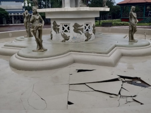 Mais um probleminha para a prefeitura de Campo Mourão resolver. Estourou parte do piso do chafariz da praça Getúlio Vargas. Aparentemente foi infiltração. Foto: QI TV