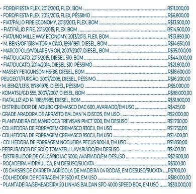 A prefeitura de Moreira Sales fará leilão no próximo dia 16 (9h). São 26 lotes, incluindo carros, caminhões, ônibus, micro-ônibus, vans, máquinas e implementos agrícolas. Entre os veículos, o mais barato é um caminhão Mercedes 1313, ano 1978, por R$ 5 mil. Tem 42 anos de uso e está em "péssimo estado". O mais caro é uma patrola ano 2007 por R$ 98 mil.