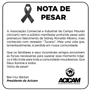 A Acicam divulgou nota de pesar pela morte do vereador Tucano Ribeiro, de Campo Mourão. "Mais uma vida que, lamentavelmente, é perdida em nossa comunidade", destaca trecho do texto assinado pelo presidente Ben-Hur Berbet.