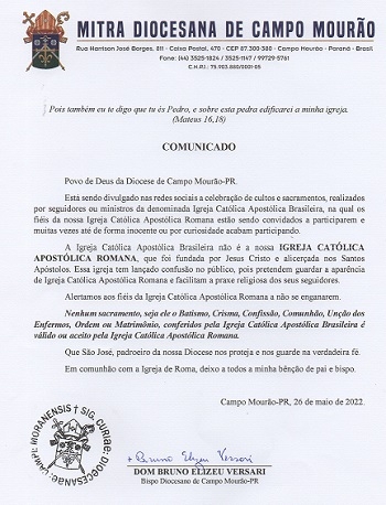 O bispo de Campo Mourão, d. Bruno Versari, divulgou comunicado sobre a Igreja Católica Apostólica Brasileira. "Não é a nossa igreja Católica Apostólica Romana", destaca o texto. Segundo ele, fieis da "romana", por inocência ou curiosidade, estão participando de celebrações da "brasileira". Versari ressalta que os sacramentos da "brasileira", como batismo e casamento, por exemplo, não valem para a "romana".