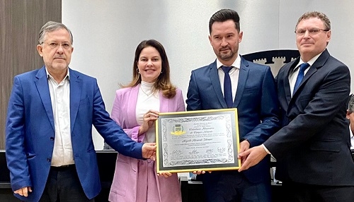 A Câmara de Campo Mourão realizou sessão solene na manhã deste sábado. Foi para a entrega do título de Cidadania Benemérita ao ex-jogador de futebol Angelo Versari. A homenagem partiu do vereador Escrivão Parma, que fez a entrega junto com o prefeito Tauillo Tezelli.