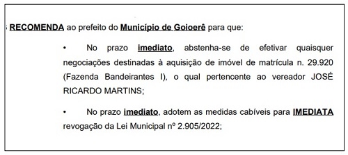 O Ministério Público emitiu nova recomendação administrativa para a prefeitura de Goioerê.