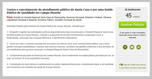 A suspensão de parte dos serviços da Santa Casa de Campo Mourão virou tema de um abaixo-assinado online.