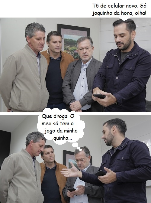 Os cliques são de quarta-feira, quando o prefeito Tauillo Tezelli e o secretário de Saúde de Campo Mourão, Sérgio Henrique dos Santos, estiveram na Câmara para protocolar o projeto dos celetistas. O presidente do legislativo, Jadir Pepita, e o vereador Bina Teixeira acompanharam atentos o que o secretário mostratava no celular. O qu era? Mistéééério...